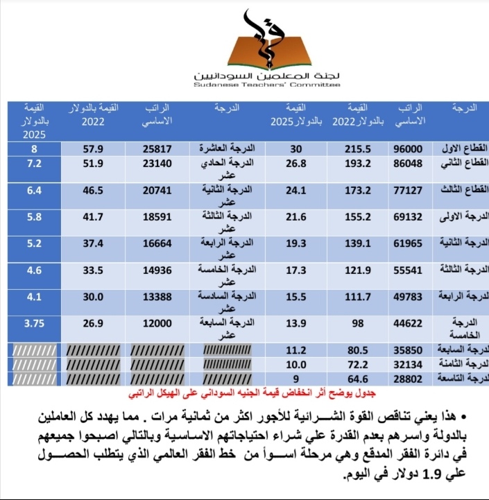 وأوضحت أن المرتب الأساسي للدرجة (١٧) مدخل خدمة العامل وهو (١٢ ألف جنيه سوداني) أي ما يعادل ثلاثة دولارات ونصف تقريبا، في الشهر. وأن مرتب الدرجة التاسعة مدخل خدمة المعلمين (٢٨ ألف و٨٠٠ جنيه سوداني) وتعادل (٩ دولارات) في الشهر. بينما المرتب الأساسي للدرجة الأولى لمعلم عمل ما يقارب الثلاثين عاما، في الخدمة، (٩٦ ألف جنيه سوداني) يعادل (٣٠ دولارا) في الشهر.