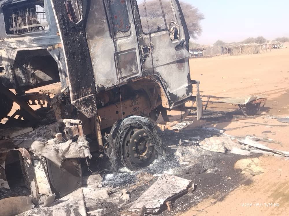 وقالت غرفة طوارئ مدينة الكومة في تعميم مصحوباً بمقاطع مصورة اليوم الثلاثاء، إن “طائرات مسيرة تابعة للجيش السوداني قصفت شحنات إغاثة تابعة لبرنامج الغذاء العالمي محملة بالمساعدات الإنسانية، كانت في طريقها إلى النازحين في مخيم زمزم وطويلة، مما أدى إلى تدمير نحو 25 عربة شاحنة ومقتل 4 موظفين في برنامج الأغذية العالمي”.
