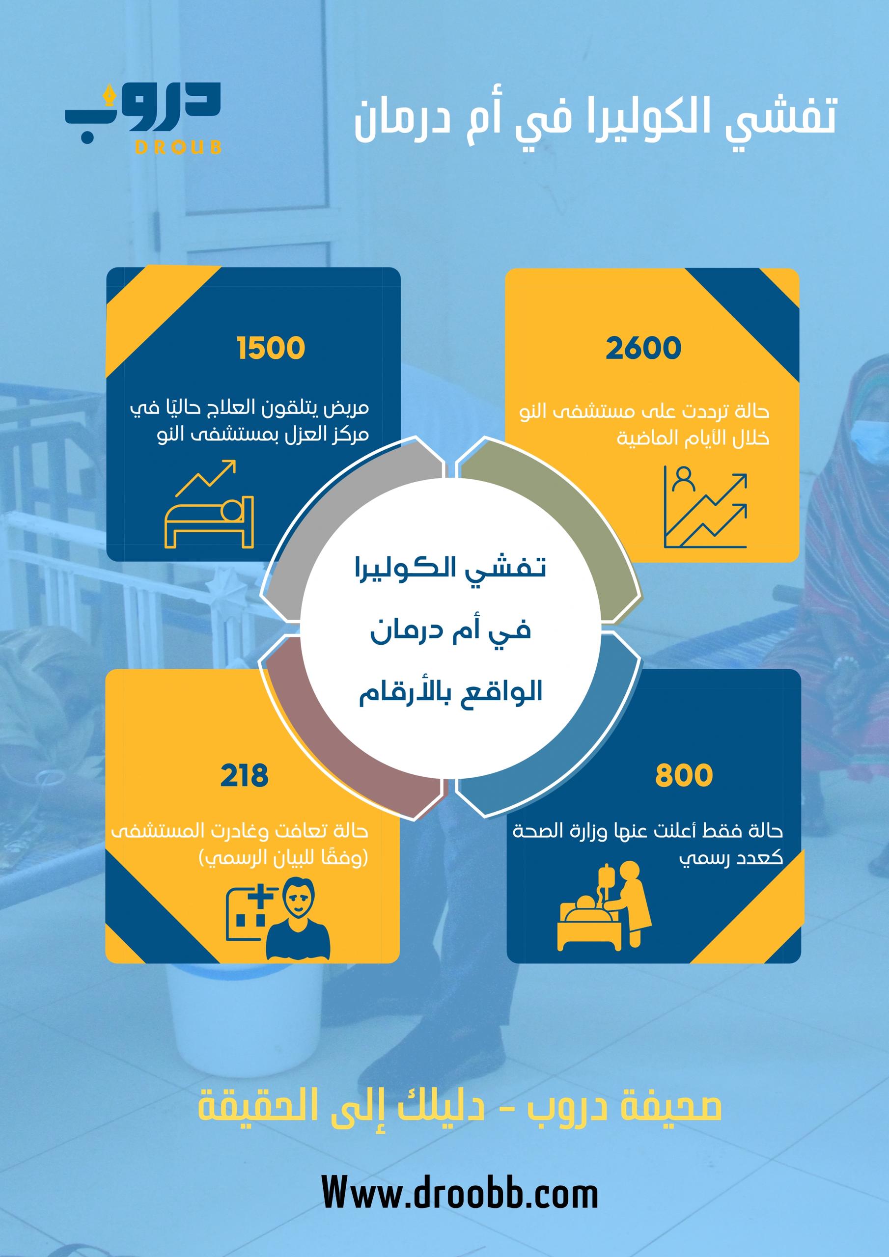 وأوضحت ذات المصادر أن مستشفى النو شمال مدينة أمدرمان استقبلت أكثر من 1500 مريض بالكوليرا يتواجدون الآن بمركز العزل.