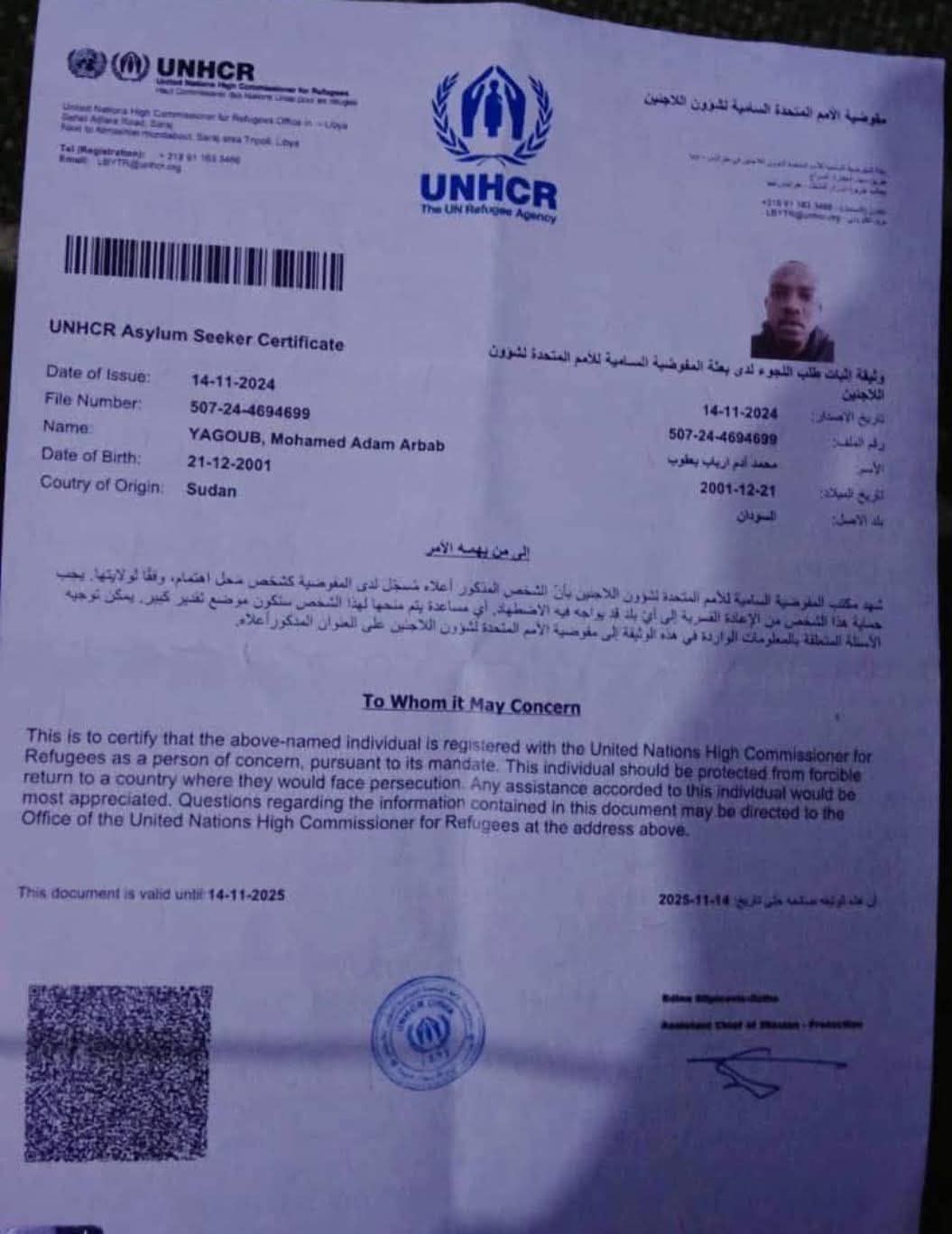يحمل”توباك” وثيقة لاجئ صادرة عن مفوضية الأمم المتحدة لشؤون اللاجئين بالرقم 14112024.