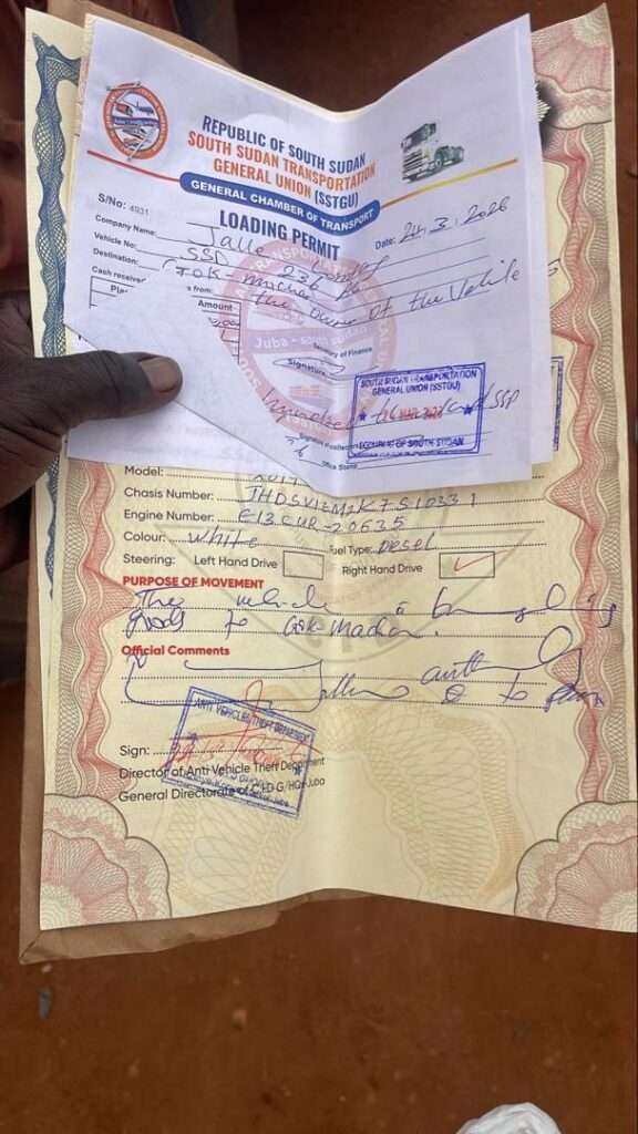 من جهته أبلغنا شرطي جنوب سوداني بأنهم يستخرجون الأوراق، ويتابعون الشاحنة حتى تصل إلى المناطق الحدودية، “ويعملون على تسهيل مرورها عبر جماعاتهم في الحدود” بحسب قوله.