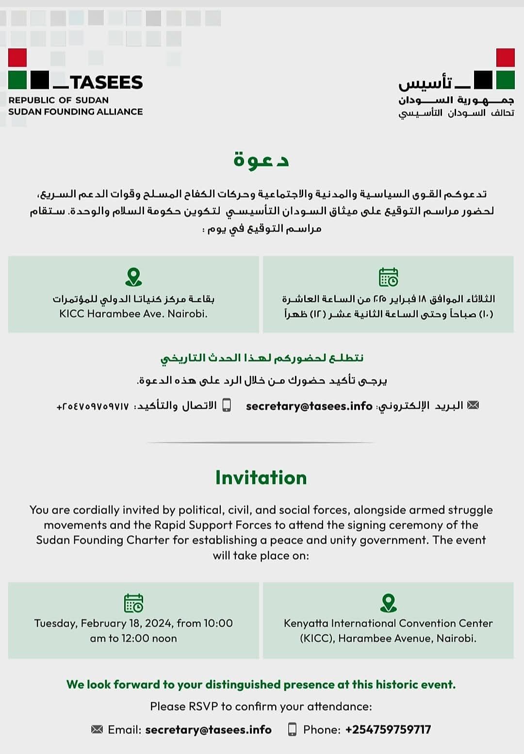 وقالت هذه القوى في دعوتها التي اطلعت عليها “دروب”: “تدعوكـم القـوى السياسـية والمدنية والإجتماعية وحركات الكفاح المسـلح وقوات الدعم السريع، لحضور مراسـم التوقيع على ميثاق السـودان التأسيسـي لتكوين حكومة السلام والوحدة”.